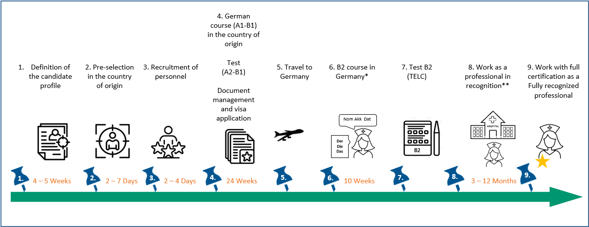 As a skilled worker, you will be recruited abroad and then (further) qualified for the labor market in Germany. Your future employers, who are looking for skilled workers, are supported by the IB partner organizations abroad, which take over the pre-selection process. Their recruitment - e.g. as nurses in hospitals - is carried out by the IB, its partners and the clients (employers).